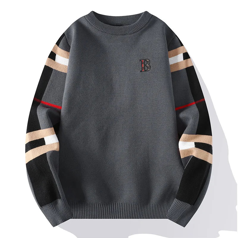 Premium knit sweater features striking contrast sleeves adorned with bold stripes and accent detailing, seamlessly blending classic charm with contemporary edge.