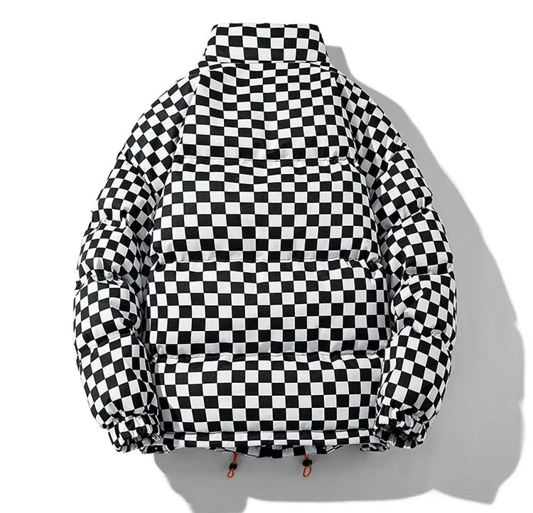 All-over checkered pattern offers a retro-meets-modern vibe, while the puffer design ensures warmth and comfort in cooler weather. With its high collar and zip-up front, this jacket is as practical as it is stylish.